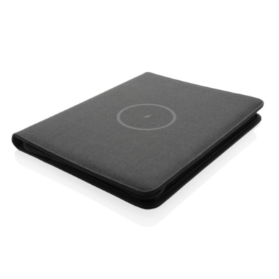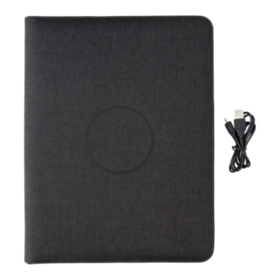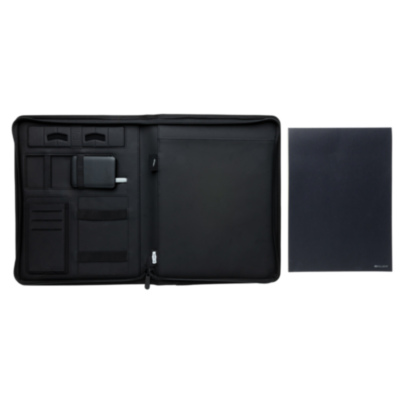 Este portafolio con bloc de notas color crema de 20 hojas y 70 gramos cuenta con la última tecnología. La tapa frontal tiene una plataforma de carga inalámbrica para tu teléfono (Android de última generación, iPhone 8 y superior). Los teléfonos y tablets más antiguos se pueden cargar a través de los puertos USB del powerbank de 5.000 mAh. Entrada: 5.0V/2.1A. Salida 1: 5.0V/2.1A. Salida 2: 5.0V/2.1A. Salida inalámbrica: 5W. Diseño registrado®