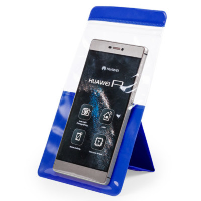 Práctico portatodo impermeable en PVC en atrevido diseño bicolor, con función táctil y soporte integrado.
