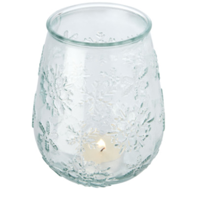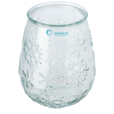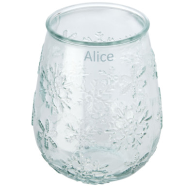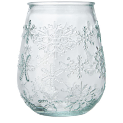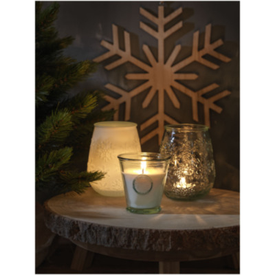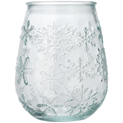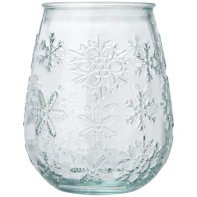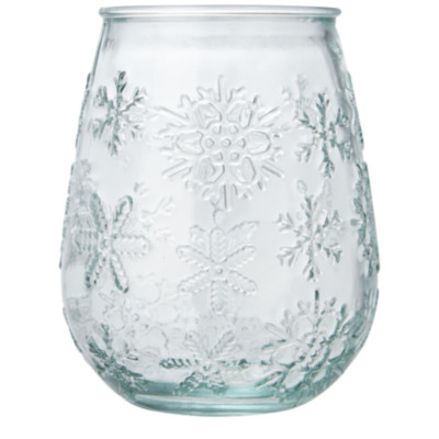 Portavelas de vidrio reciclado para velas flotantes con efecto de copo de nieve. Fabricados a partir de una botella de vidrio. El vidrio reciclado utiliza menos energía, materia prima y aditivos para su fabricación de lo que es habitual en la fabricación de vidrio tradicional. Vela flotante no incluida.