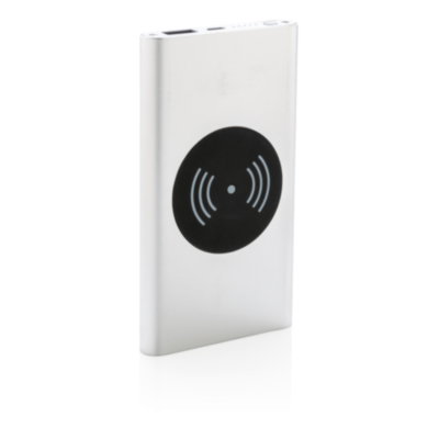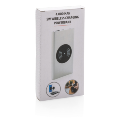 Powerbank fina de 4.000mAh con batería interna de alta calidad y cargador inalámbrico integrado de 5W. Incluye botón on/off e indicador de batería restante. Salida 5V/2.1; Entrada 5V/1.5A; Salida inalámbrica 5W.