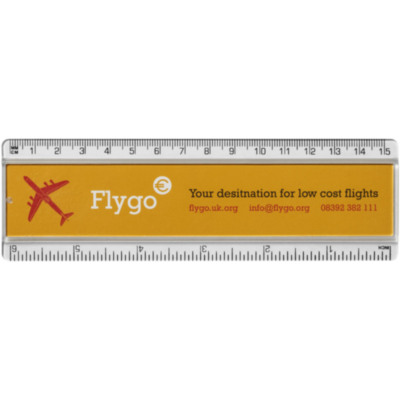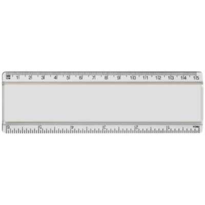 Regla plástico con inserto de papel con marcas tanto en pulgadas como en centímetros.