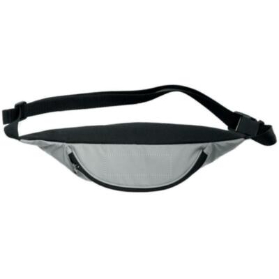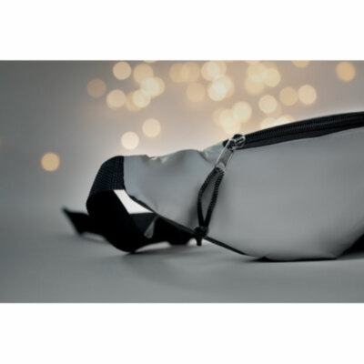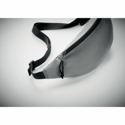 Riñonera con frontal en poliéster altamente reflectante, con correa de poliéster ajustable.