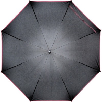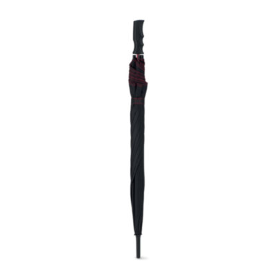 Paraguas de 23" anti-viento de apertura automática en pongis 190T con caña y costillas en fibra de vidrio y puntas de plástico negro. Paneles en negro puntadas a juego. Mango en plástico negro liso.