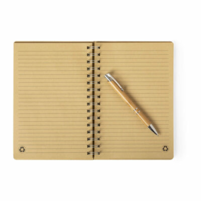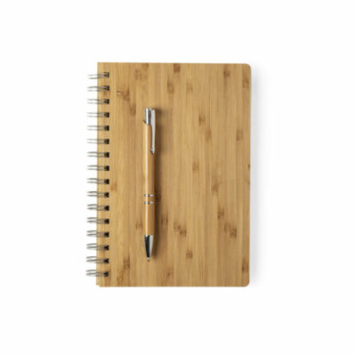 Set de libreta y bolígrafo en línea nature. Incluye libreta de anillas con tapas rígidas en bambú, con 80 hojas de disposición a una raya y diseño eco. Bolígrafo de mecanismo pulsador, con cuerpo en bambú y accesorios metálicos -cartucho jumbo y tinta negra-. Presentado en estuche de cartón troquelado y diseño eco.