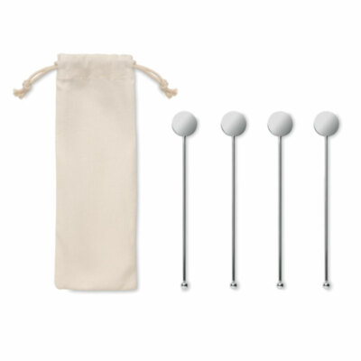 Set de 4 agitadores de bebidas de acero inoxidable, presentados en una bolsa de algodón.