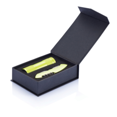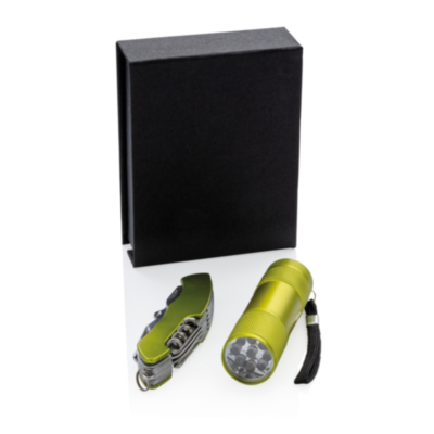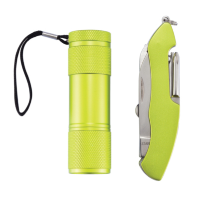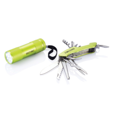 Navaja de bolsillo de hoja grande con 13 funciones; sierra, quita escamas, saca clavos, tijeras, abrebotellas, destornillador, abrelatas, sacacorchos, destornillador de estrella, navaja pequeña, lima de uñas y punzón, además de la linterna Quattro de aluminio.