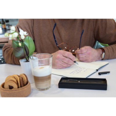 Simple pero elegante. Gracias al acabado mate, este juego de bolígrafos tiene una sensación de lujo y es muy agradable al tacto. El conjunto consta de un bolígrafo y un roller. Ambos contienen tinta alemana Dokumental® para una escritura ultra suave. La longitud de escritura para el bolígrafo es de 1200 metros, para el roller es de 400 metros. Viene en una caja de regalo de color a juego.