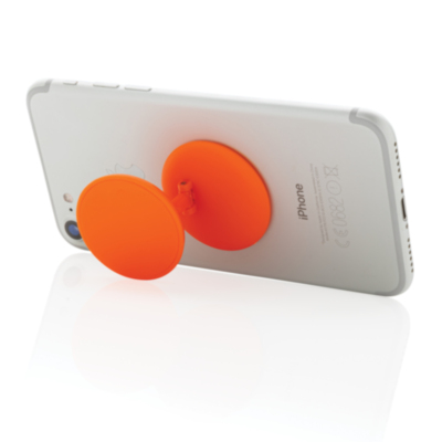 Soporte para teléfono multifunción, soporte y enrollador de cable. Fácil de colocar con cinta adhesiva en la parte posterior de tu dispositivo móvil. Perfecto para tomar selfies, ver videos o hablar con tus amigos. Incluye adhesivo adicional para base de vidrio y colocarlo en iPhone 8, X y Xs para asegurar la adhesión. Hecho de material reciclable de PP. Diseño registrado.