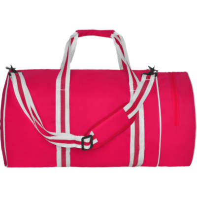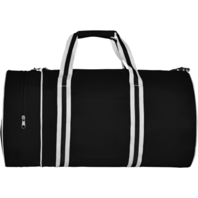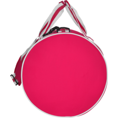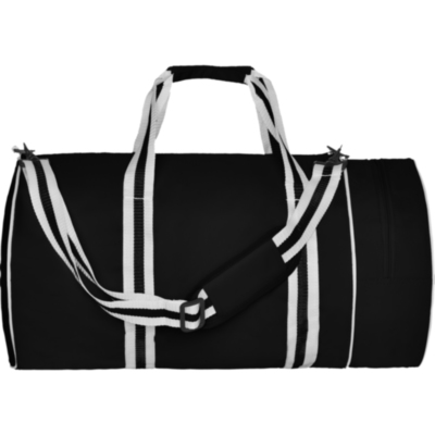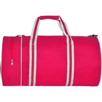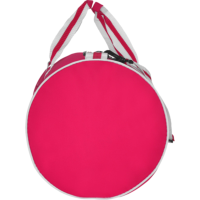 Bolsa de diseño cilíndrico, elaborada en poliéster con asas de nylon. Bolsillo lateral con cremallera.