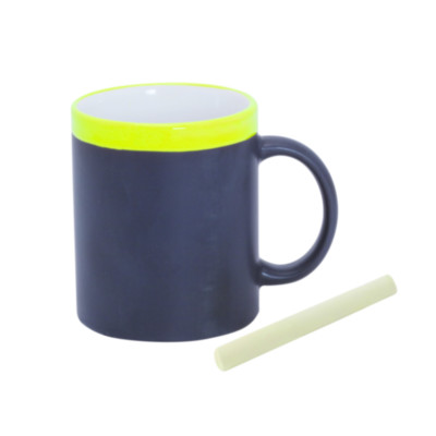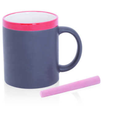 Taza de cerámica de 350ml de capacidad con cuerpo negro pizarra para pintar y boca en divertida gama de vivos colores. Tiza incluida a juego y presentada en caja individual.