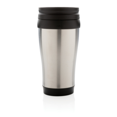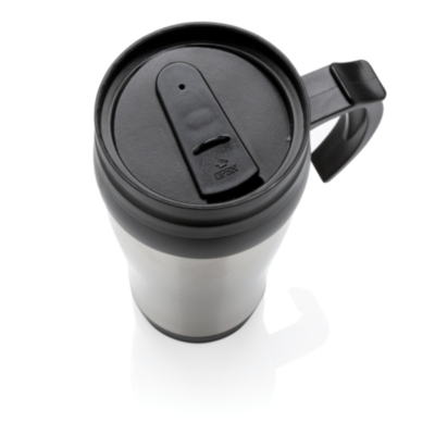 Taza con capadidad de 350ml, de acero inoxidable exterior, PP interior, y asa, tapa para beber y parte inferior en ABS negro.