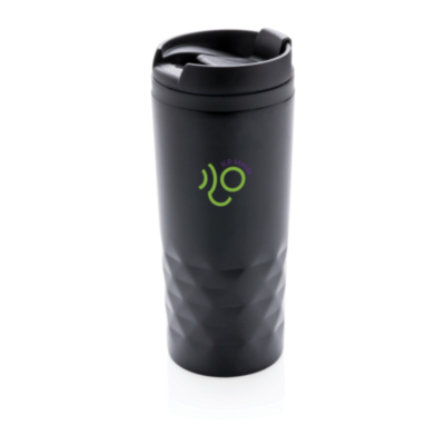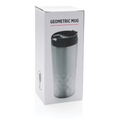 Moderna taza de acero inoxidable con detalles geométricos. Cuerpo interno de plástico. Únicamente lavar a mano. Contenido 300ml.