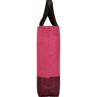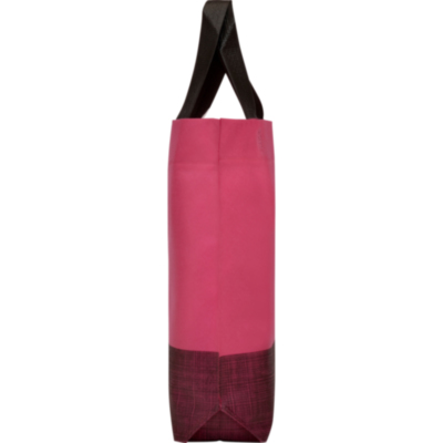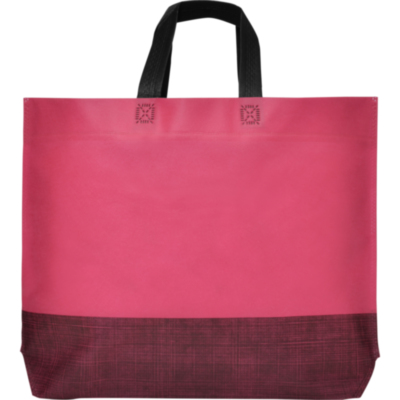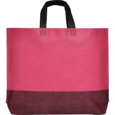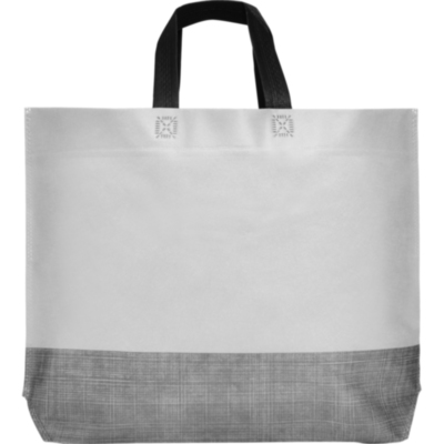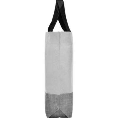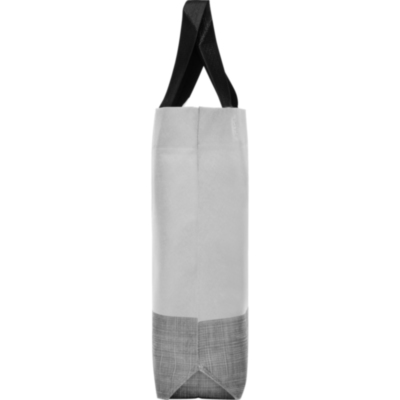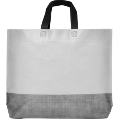 Bolsa termosellada con fuelle hexagonal en la base, fabricada en tejido non woven (no tejido), en color combinado, con asa corta de cinta en color negro.