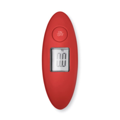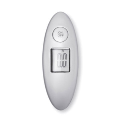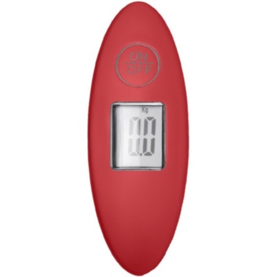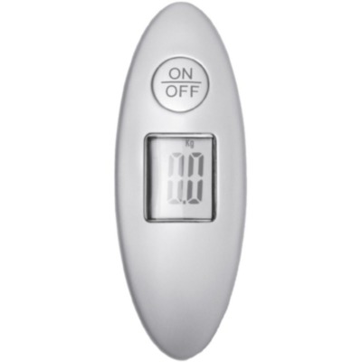 Báscula para maletas en ABS. Capacidad máxima de 40Kg. Unidades de medida en Kilos o libras. Funciona con una pila incluida. Presentada en caja individual de cartón plateada.